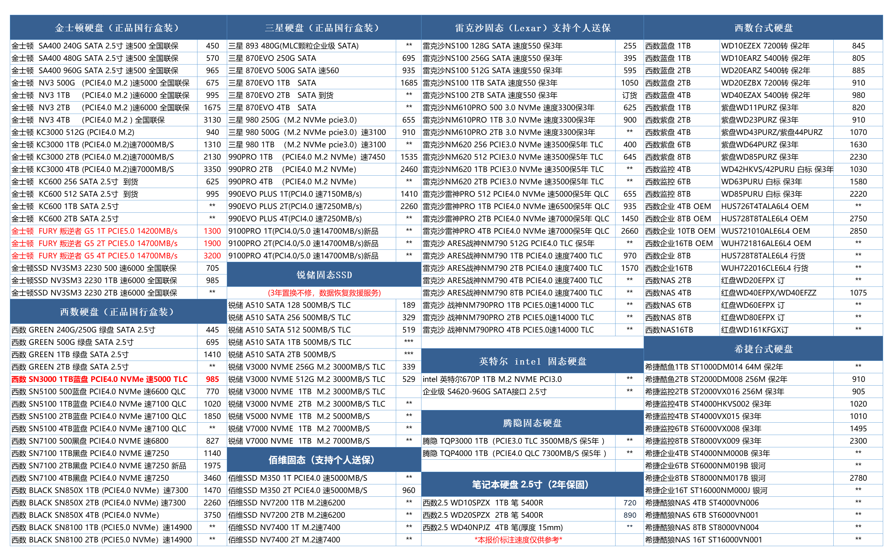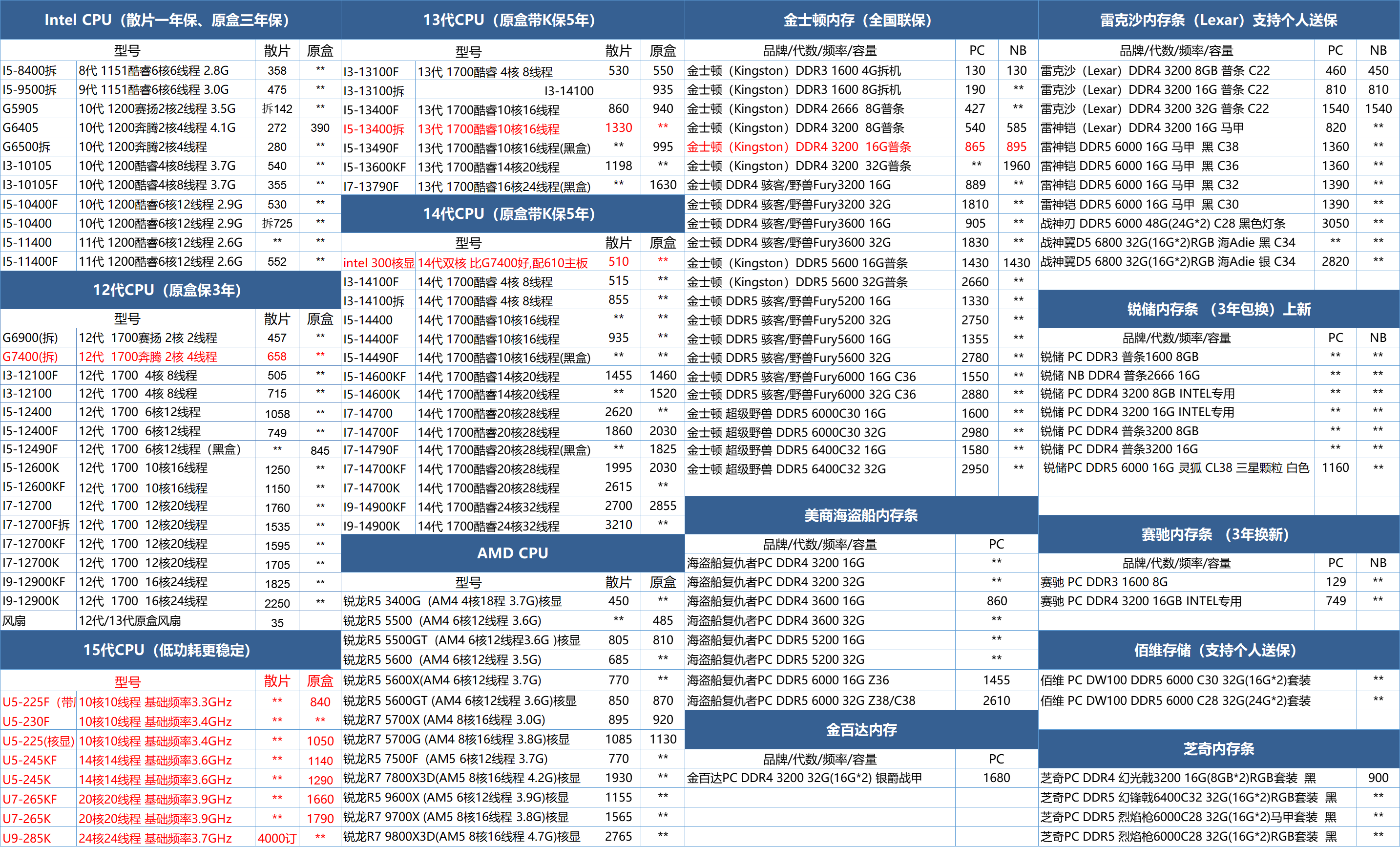 (以下价格为当天实时拿货价,仅当天有效,可提供一条龙装机服务)2026年最新电脑三大件渠道批发报价单(Intel、AMD、金士顿、海盗船、芝奇、希捷、西数、七彩虹、金百达内存固态等)