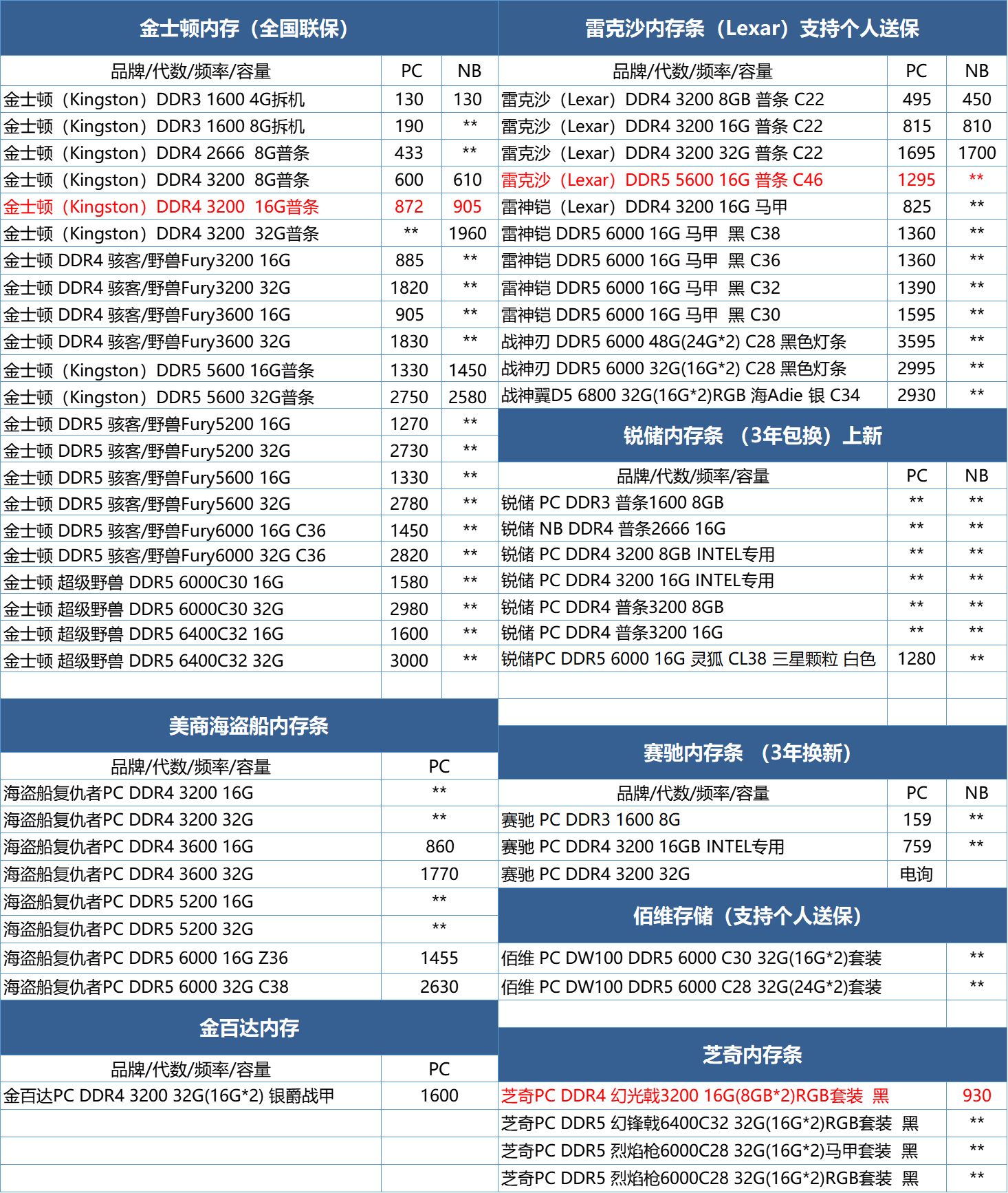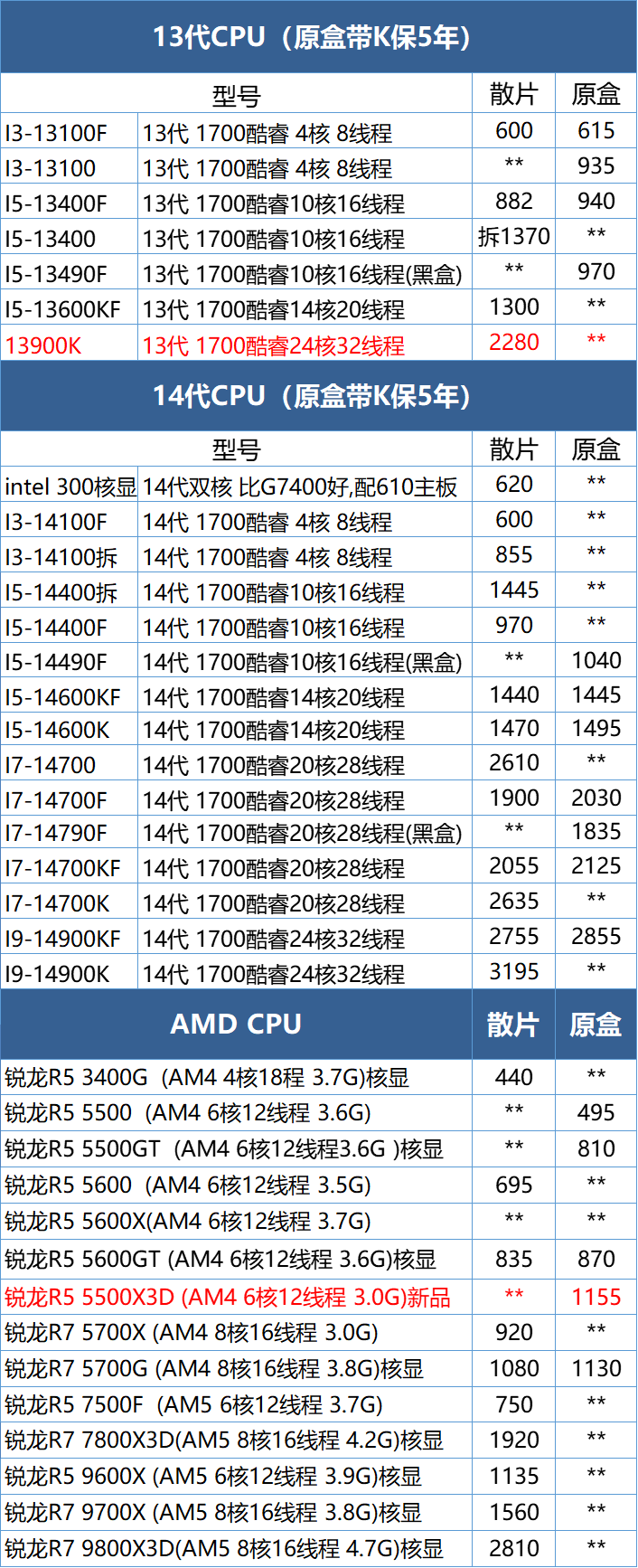 (以下价格为当天实时拿货价,仅当天有效,可提供一条龙装机服务)2026年最新电脑三大件渠道批发报价单(Intel、AMD、金士顿、海盗船、芝奇、希捷、西数、七彩虹、金百达内存固态等)