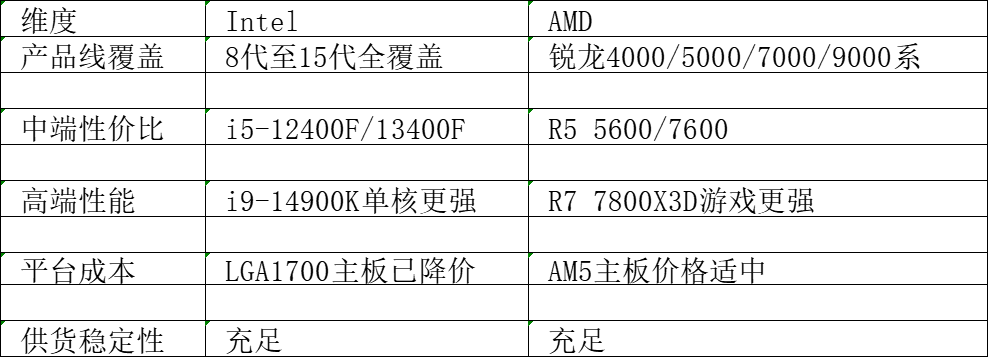 整体来看,CPU市场货源充足,价格稳定。Intel凭借丰富的产品线占据主导,中端i5系列是价格战的焦点。AMD则通过平台优惠试图吸引更多用户。对于普通消费者而言,12-14代酷睿和锐龙7000系是当前性价比最高的选择。