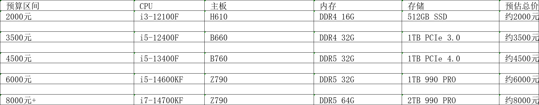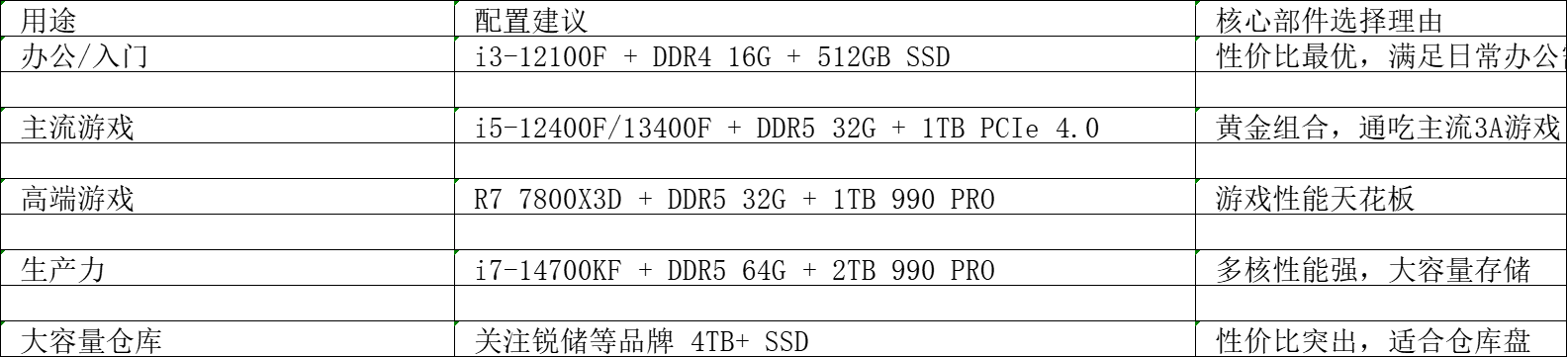 - CPU:Intel与AMD的新品交替进入稳定期,12-14代酷睿和锐龙7000系是当前性价比最高的选择