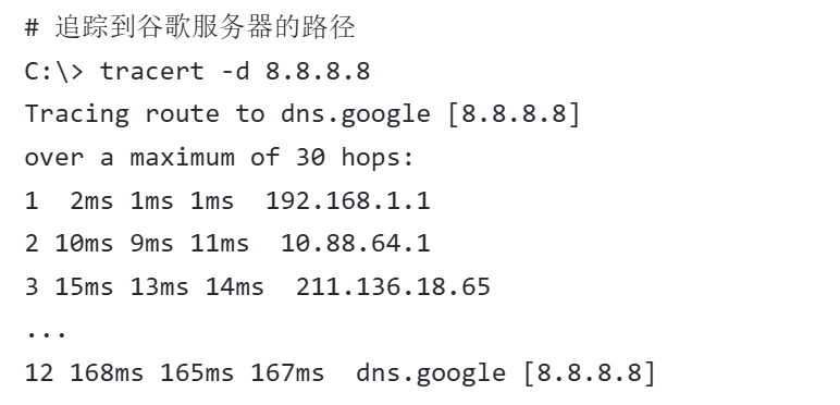 | 路径追踪 | tracert -d 8.8.8.8 | traceroute -n 8.8.8.8 |