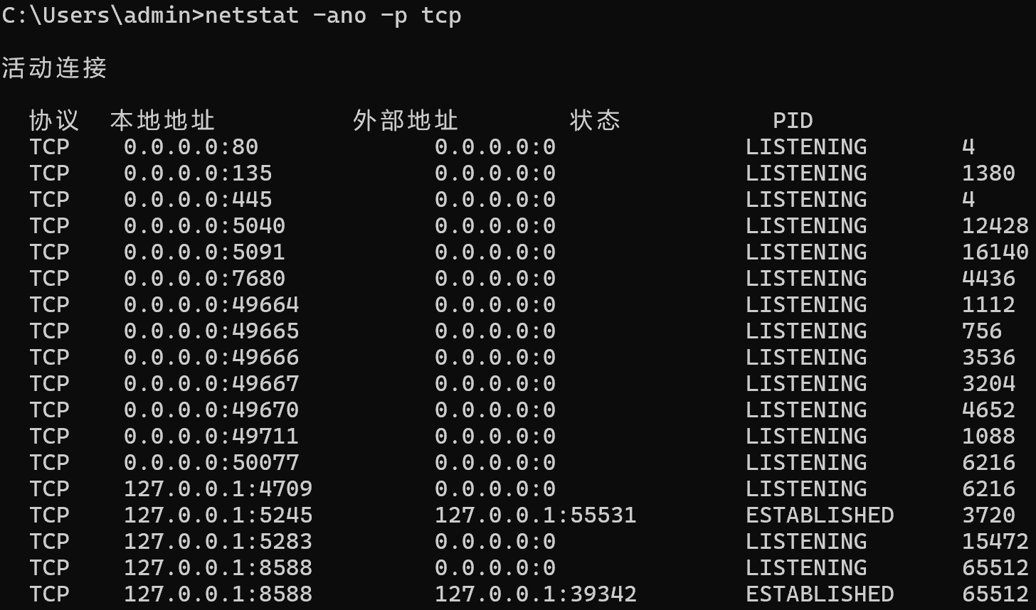 # 查看所有TCP连接及对应进程(需管理员权限)