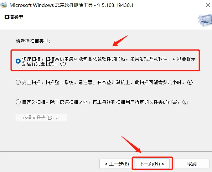 2、选择【下一页】选择【快速扫描】(任意三个选一其实也行,根据自己需要),然后选择【下一页】,等待系统扫描完毕,找到流氓软件删除即可。