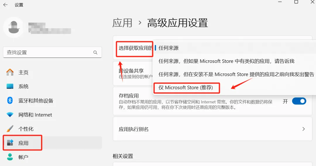 然后找到【选择获取应用位置设置】,选择【仅Microsoft Store】。(根据自己情况选择)这样设置流氓软件就不能随便自己下载安装了,但是以后只能在Microsoft Store下载软件了。