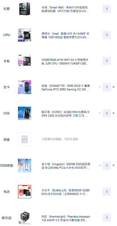 针对设计剪辑需求,使用英特尔i5-14490F搭配技嘉RTX 5060 8GB显卡、华硕B760M-AYW WIFI D4 II主板及酷芯客32GB 3200MHz内存的配置,整体表现较为均衡,能够满足多数设计剪辑场景的需求: