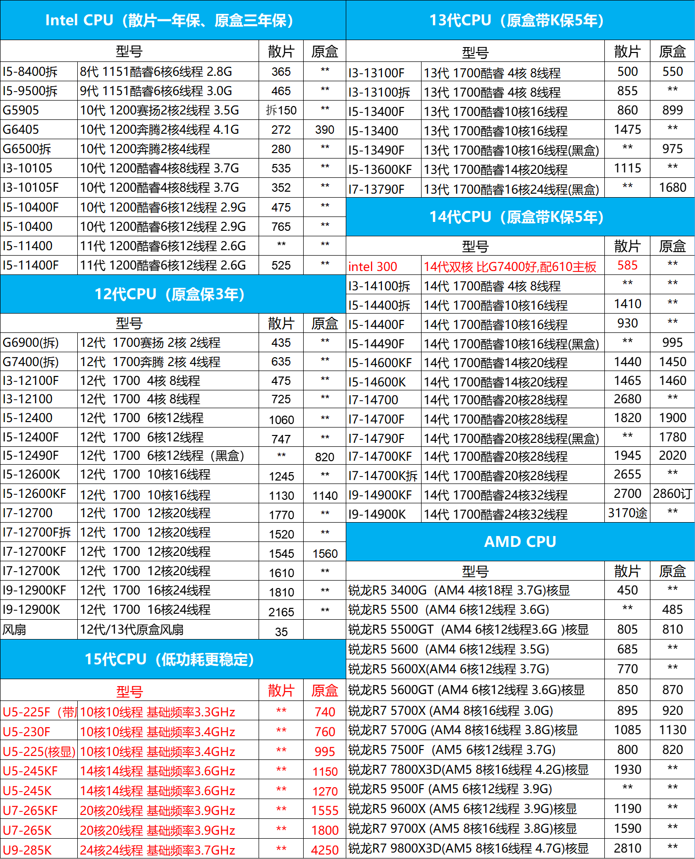 - CPU: 稳中有涨。英特尔主流及高端型号(尤其是14/15代)价格上涨压力较大,AMD平台相对平稳。新品(如15代)和热门游戏型号(如i5-12600KF)涨幅明显。