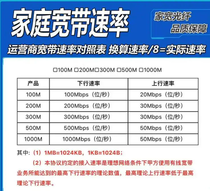 - Mbps(兆比特每秒):表示每秒传输的数据量,是衡量宽带速度的主要单位。例如,100Mbps的宽带意味着每秒可传输100兆比特的数据。
