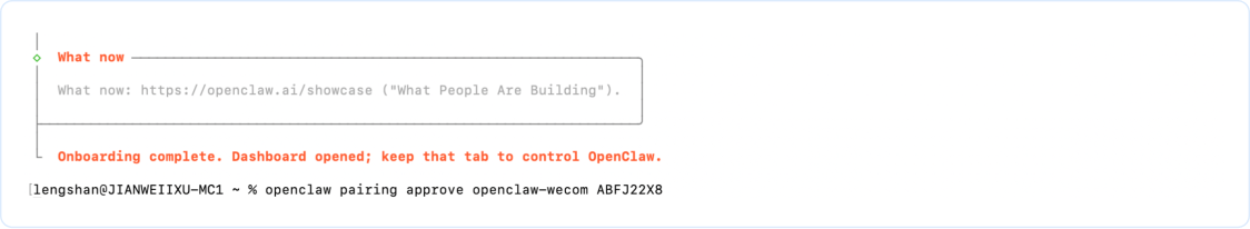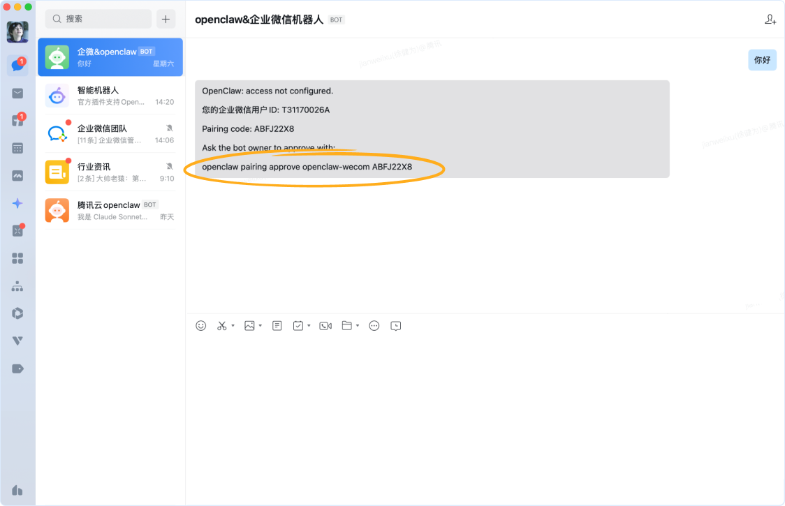 7、复制此消息最后一行,并输入在终端中。完成配对后,即可在企业微信中与机器人正常对话。