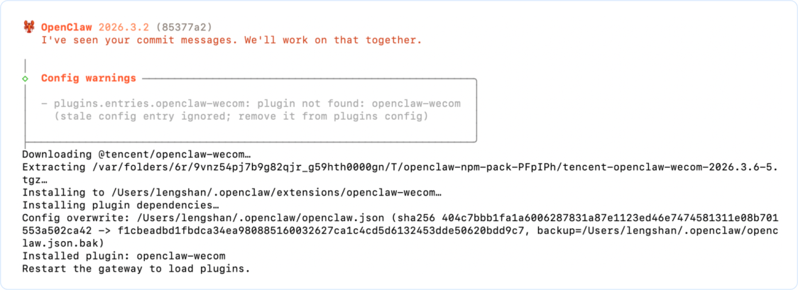 1、在本地搜索打开终端,输入以下命令,安装企微插件。安装成功后显示以下页面。