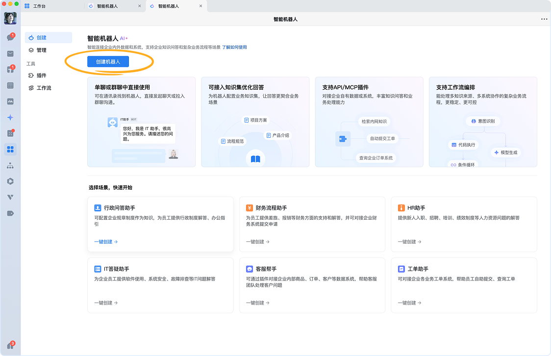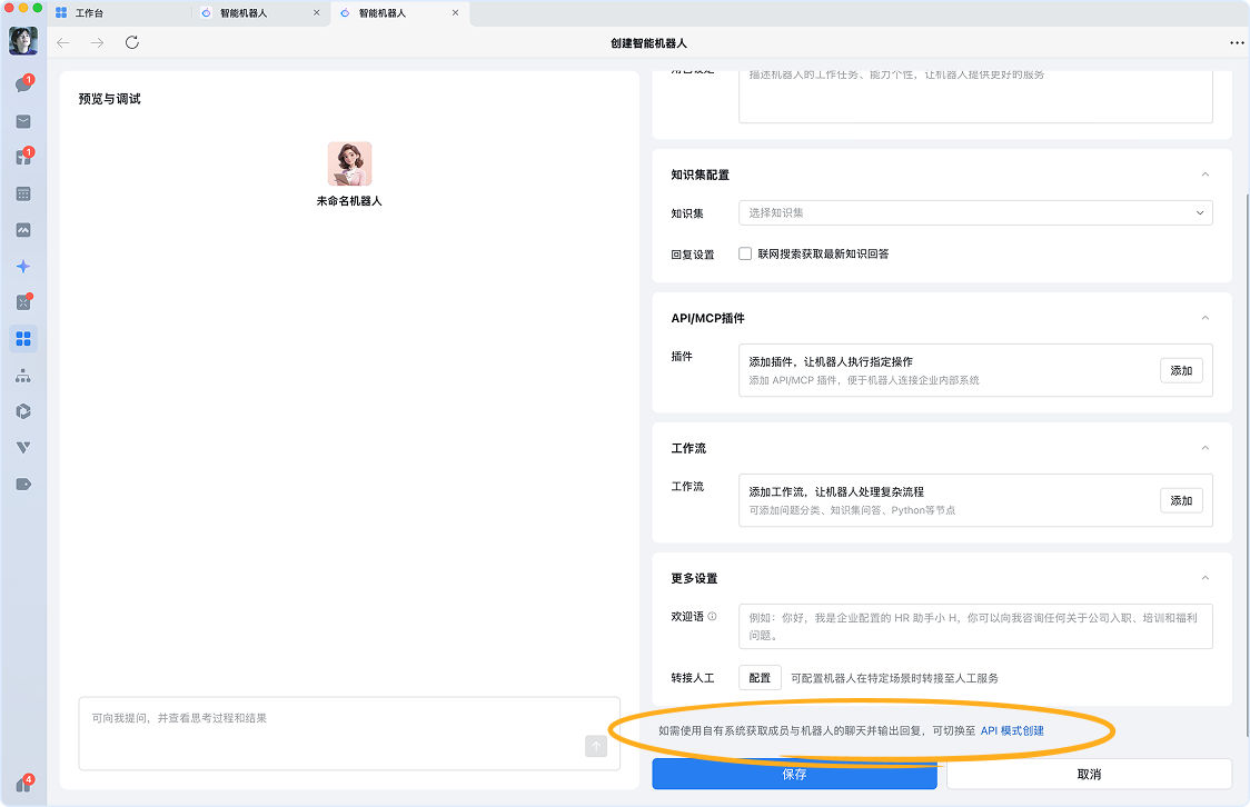 1、可在客户端-工作台,点击-智能机器人-创建机器人,选择API模式创建。