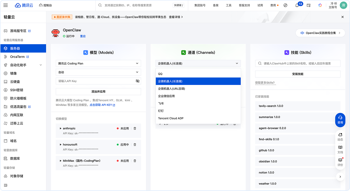 1、进入腾讯云轻量应用服务器,选中已部署OpenClaw的轻量应用服务器,点击服务器实例卡片即可进入“管理实例”页面,并进入“应用管理”页。