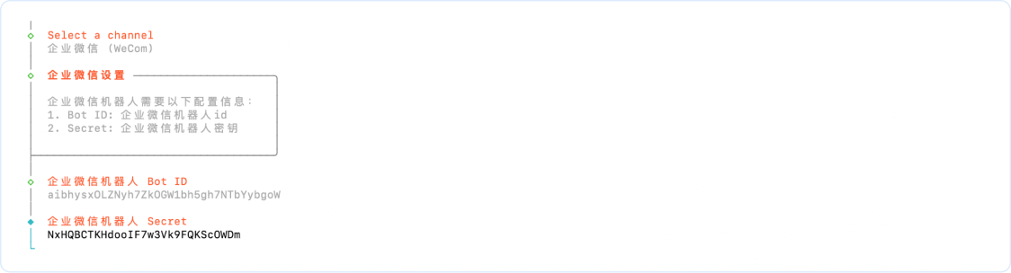 4、在select channel步骤,选择 channel 为企业微信。随后输入企业微信机器人Bot ID、Secret,并选择 finish。