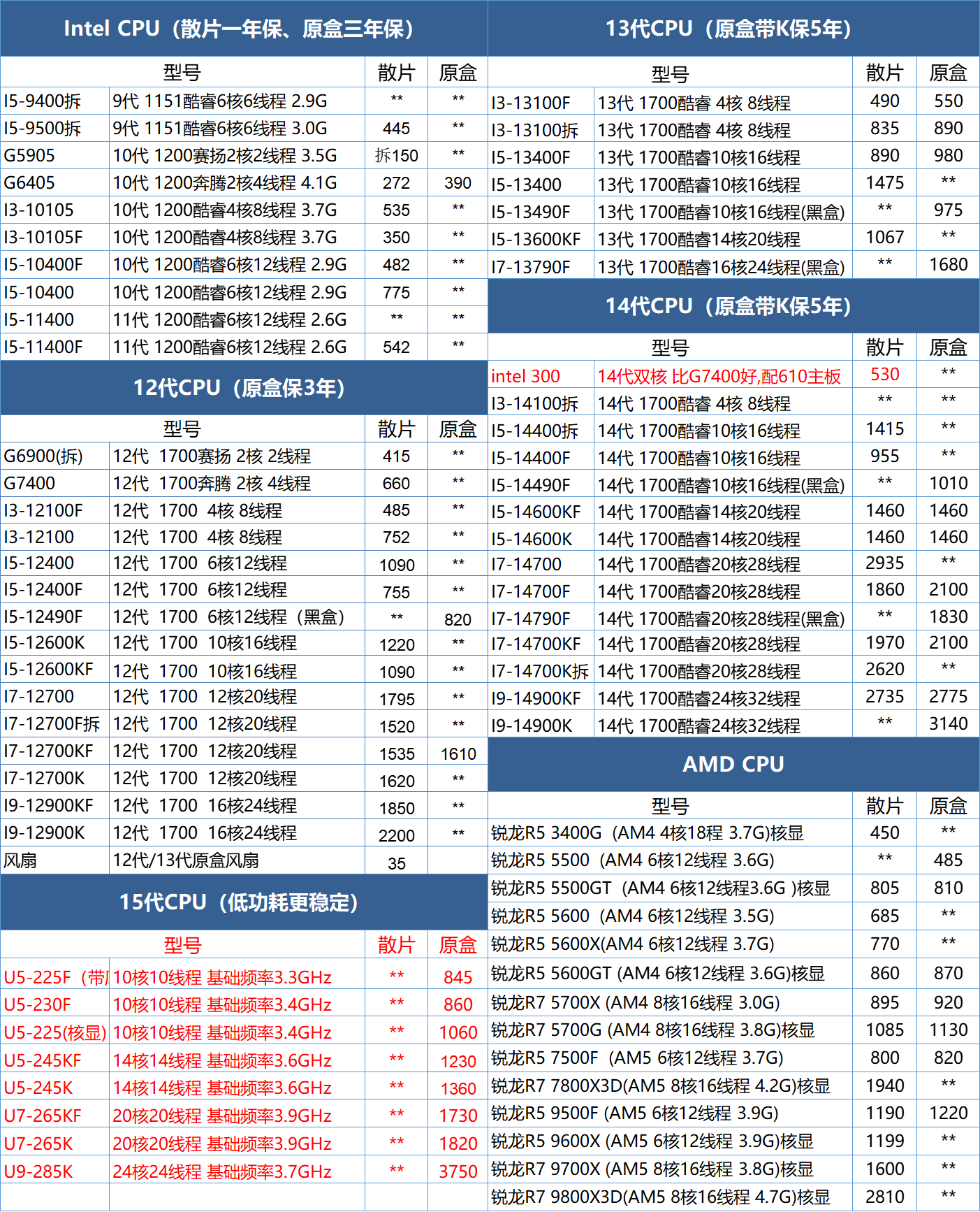 (以下价格为当天实时拿货价,仅当天有效,可提供一条龙装机服务)