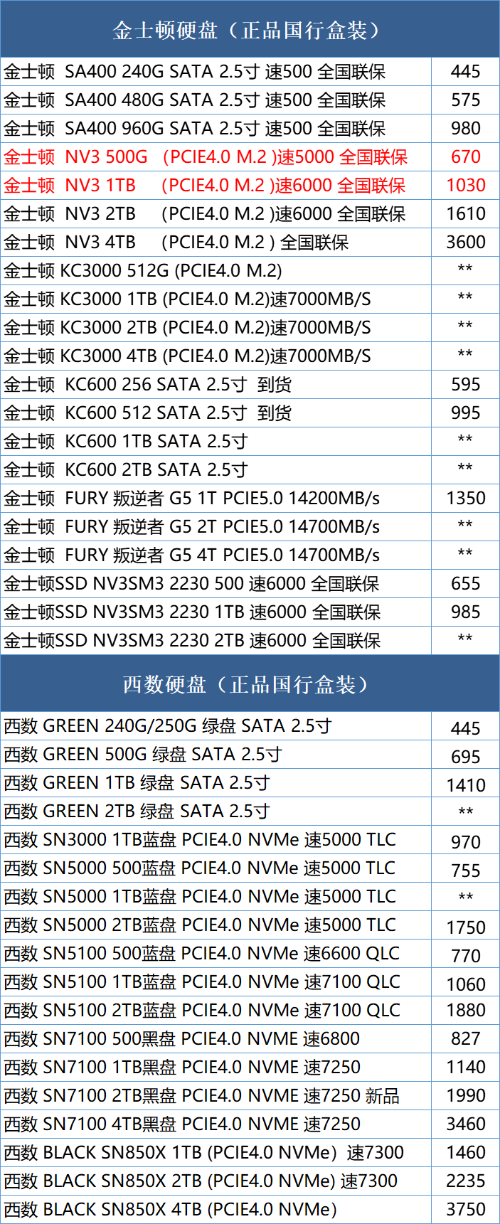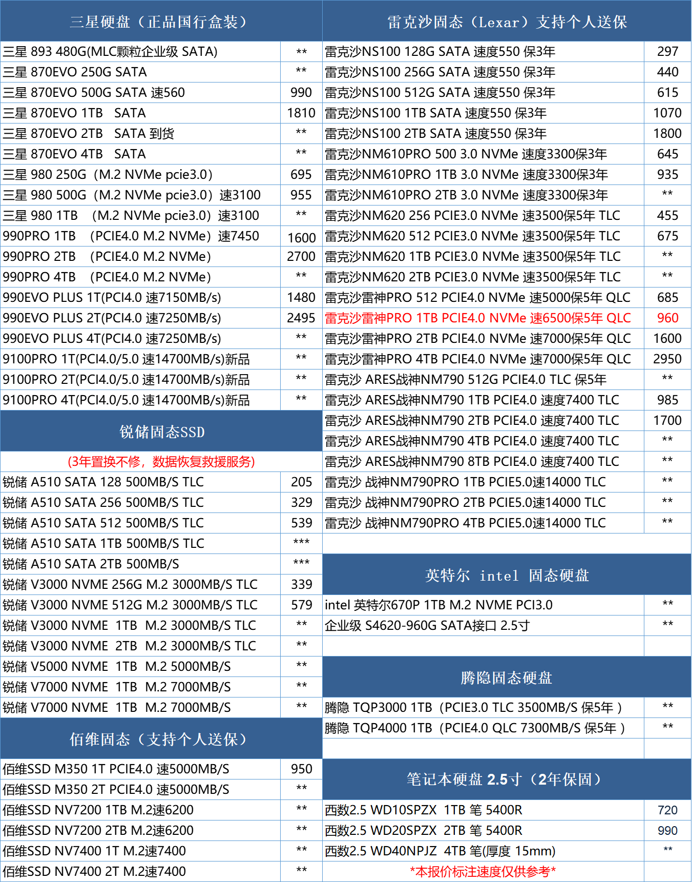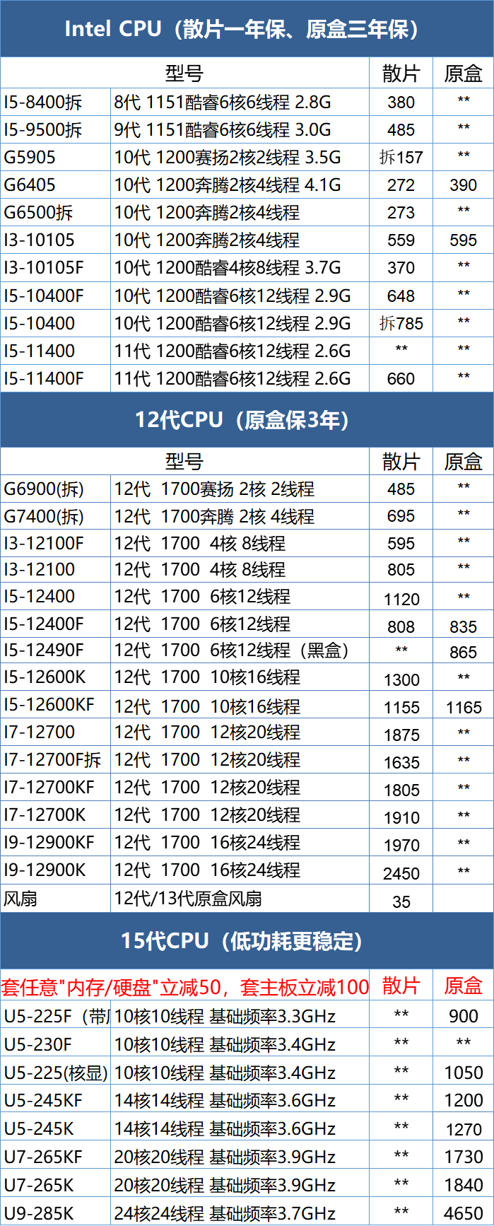 (以下价格为当天实时拿货价,仅当天有效,可提供一条龙装机服务)2026年最新电脑三大件渠道批发报价单(Intel、AMD、金士顿、海盗船、芝奇、希捷、西数、七彩虹、金百达内存固态等)