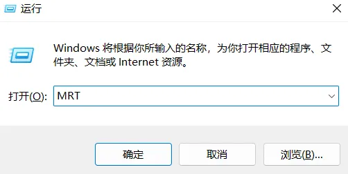 1、同时按【Win+R】,输入MRT回车,调出系统自带的恶意软件删除工具。