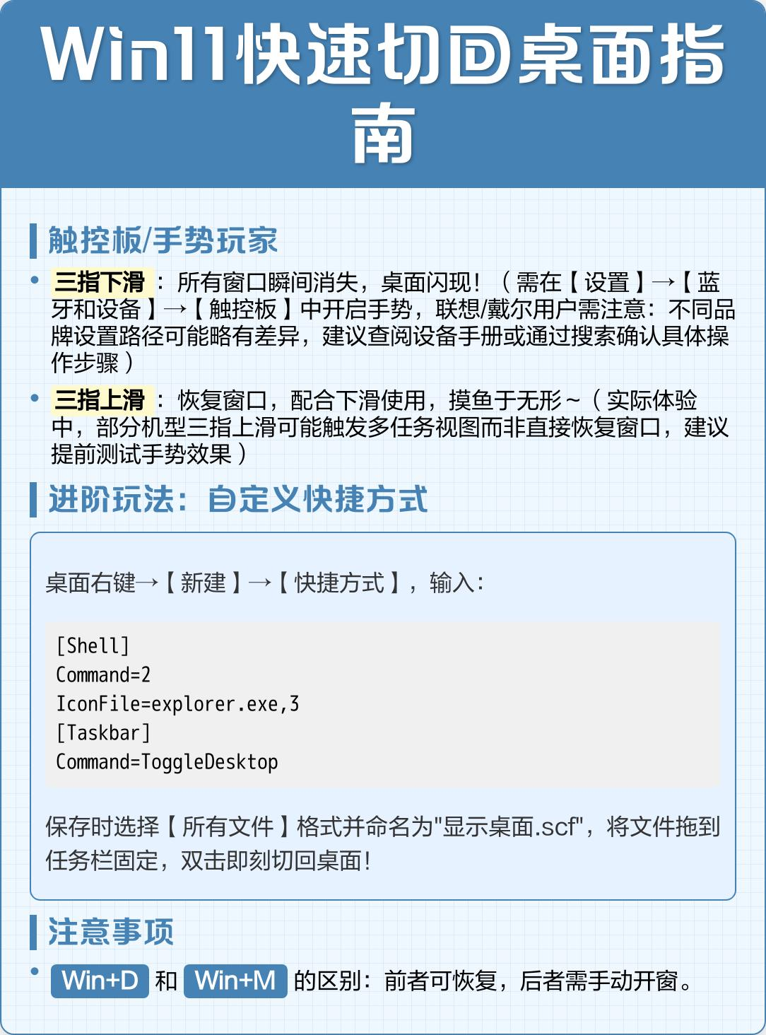 ? 三指下滑:瞬间隐藏窗口(需在【设置】→【触控板】中开启,不同品牌设置路径可能不同)