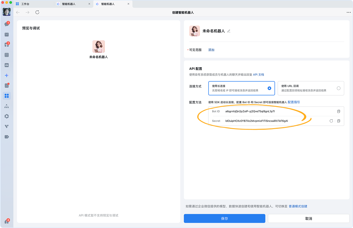 2、选择以 长连接 方式创建,并获取Bot ID 和 Secret。