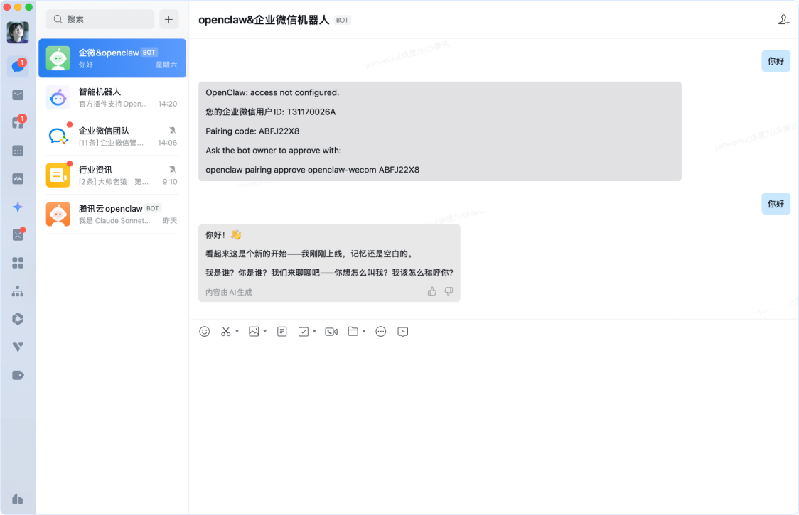 7、复制此消息最后一行,并输入在终端中。完成配对后,即可在企业微信中与机器人正常对话。