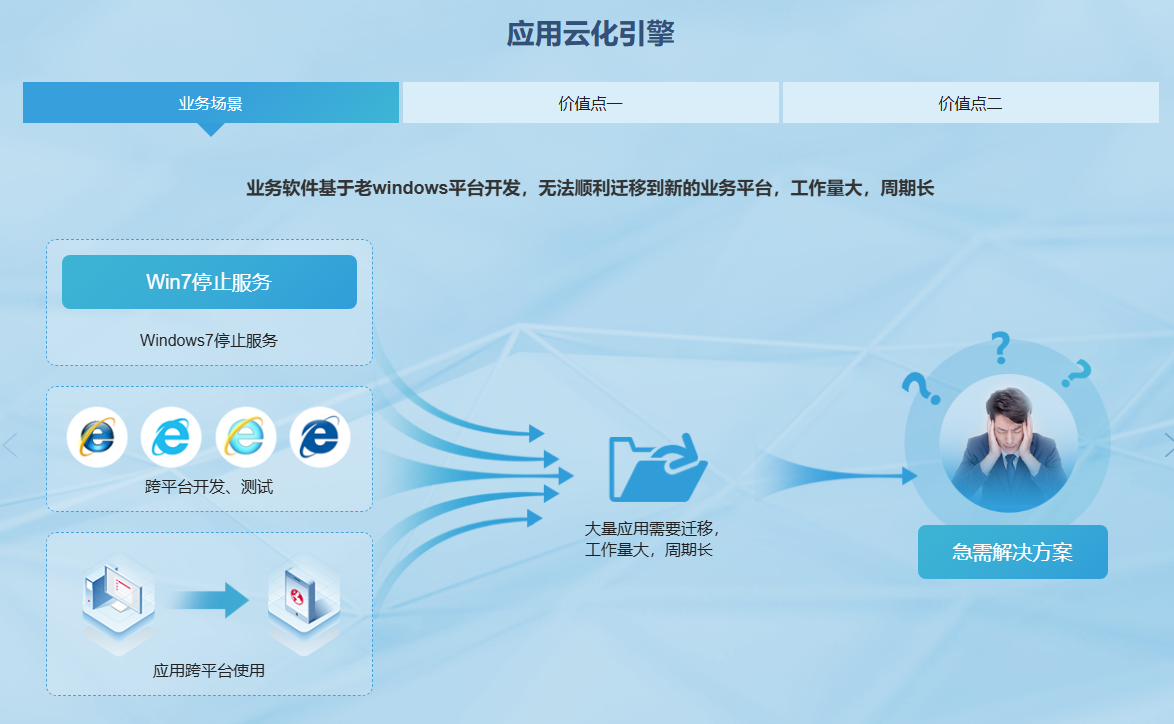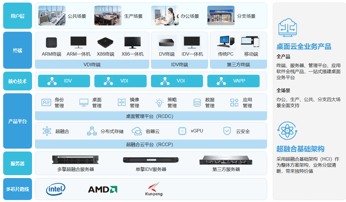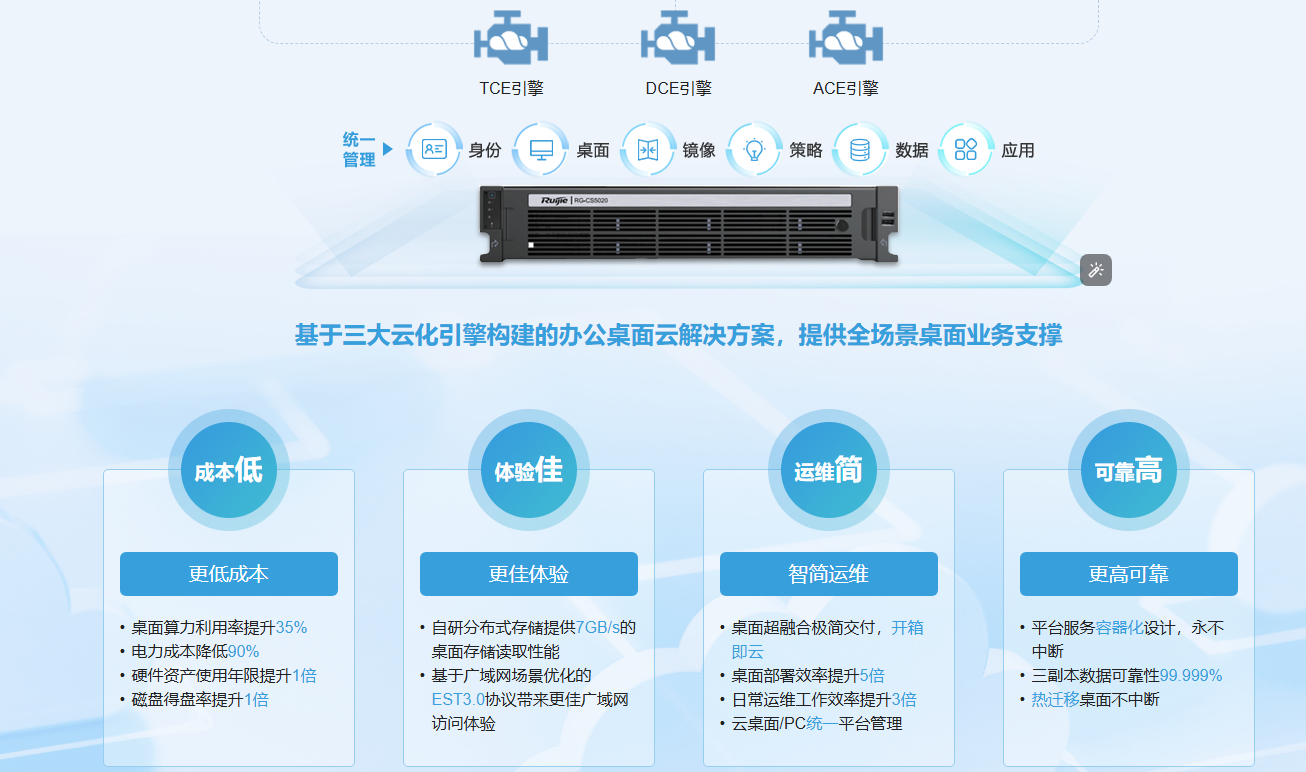 基于云计算超融合技术架构,采用全新终端云化(TCE)、桌面云化(DCE)、应用云化(ACE)引擎,帮助客户构建下一代办公桌面云解决方案。