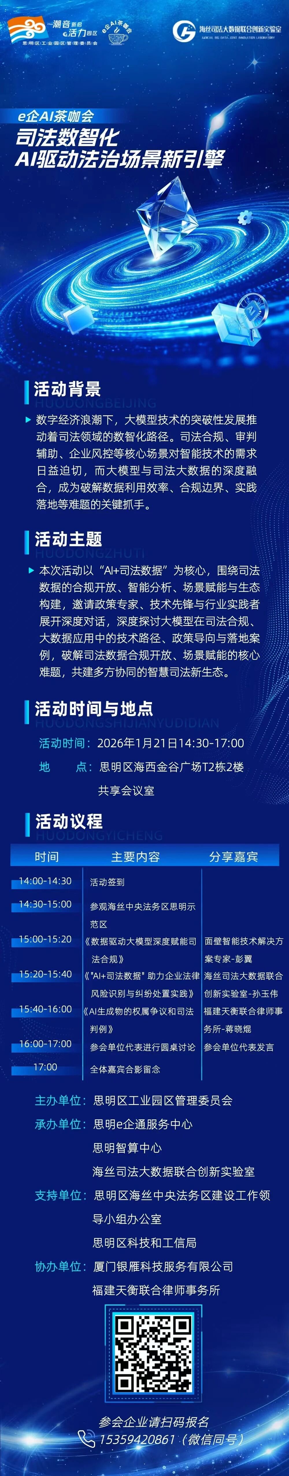 1月21日,我们诚挚邀请您参与 e企AI茶咖会——“司法数智化:AI驱动法治场景新引擎”主题沙龙,与政策专家、技术先锋、行业实践者面对面,共探AI+司法的现在与未来。