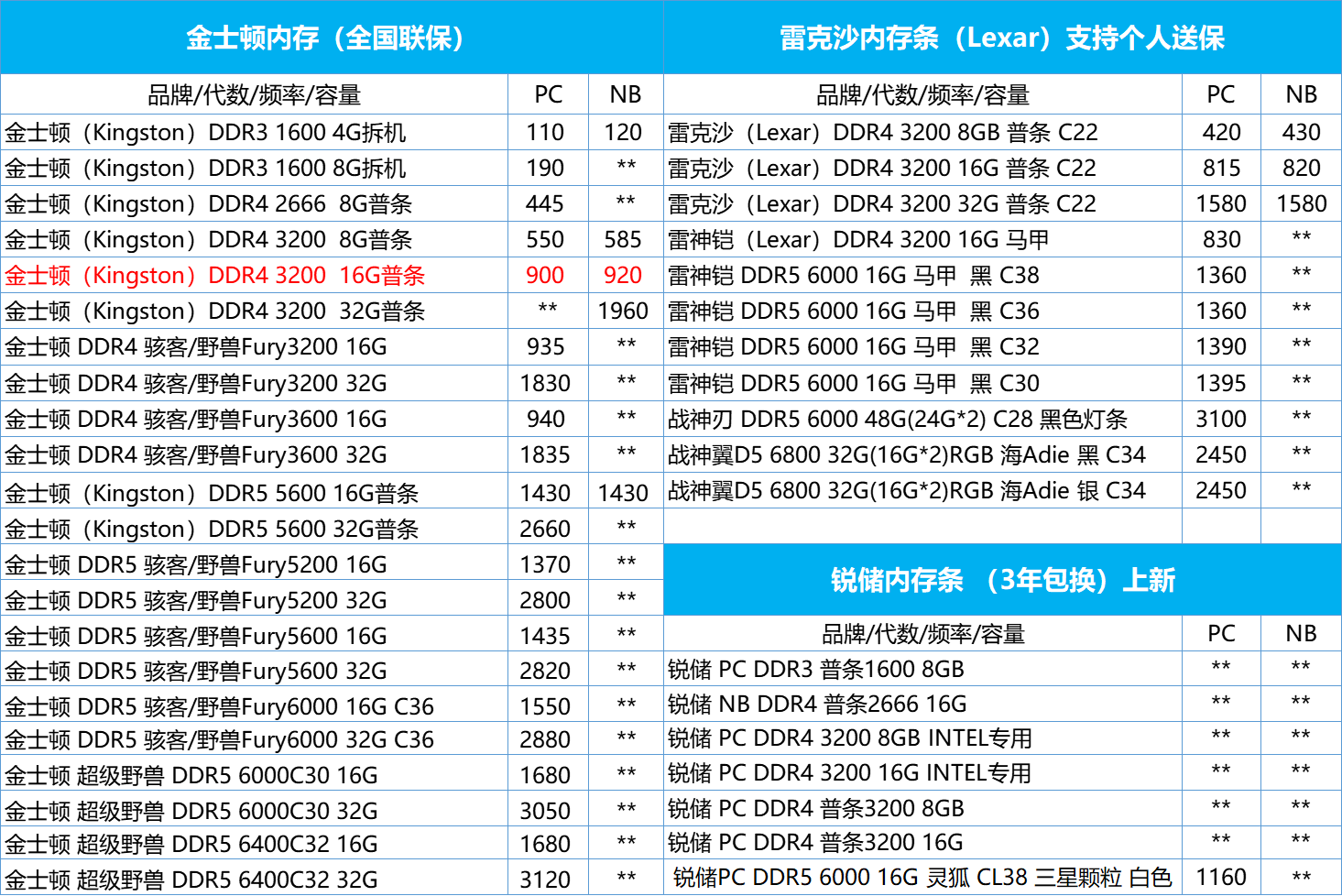- DDR4 3200 16G普条: 从 895 涨至 900 (↑5)。