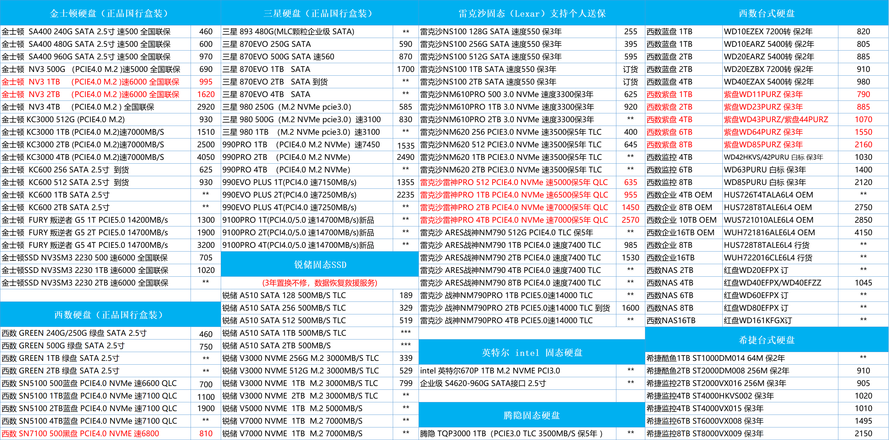 - 金士顿 KC3000 2TB (PCIe 4.0): 从 1780 大幅上涨至 2500 (↑720)。